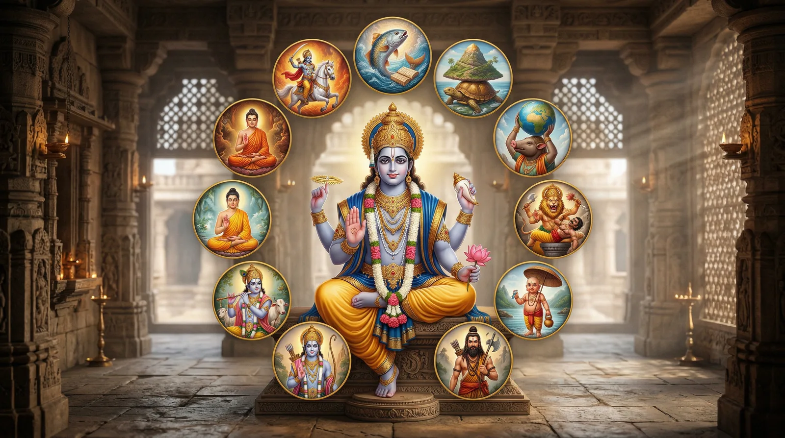 The ten avatars of Vishnu: restoring dharma through courage, humility, protection, and devotion