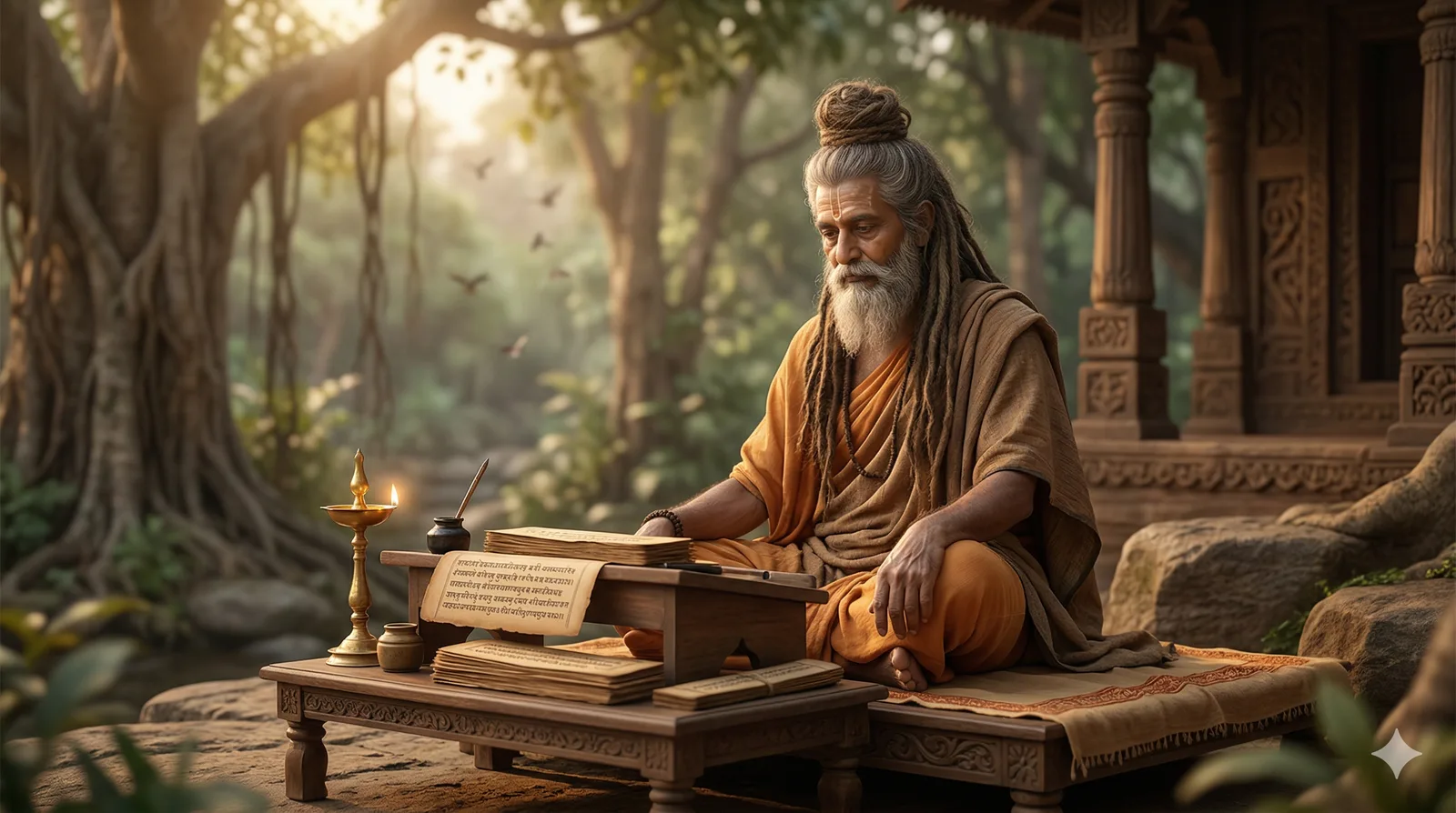 Vyasa—also revered as Vedavyasa and Krishna Dvaipayana—is one of Hindu tradition’s most influential sages, remembered as a compiler and transmitter of sacred knowledge. He is traditionally associated with the organization of the Vedas, the composition of the Mahabharata (which includes the Bhagavad Gita), and major contributions to Vedanta through the Brahma Sutras, along with connections to Puranic literature. Vyasa’s teaching is not simplistic: it confronts the complexity of dharma—duty, consequence, intention, and the moral weight of action. His path emphasizes discernment (viveka), humility before truth, and steady commitment to transmitting wisdom so future generations can live with greater clarity and responsibility.
